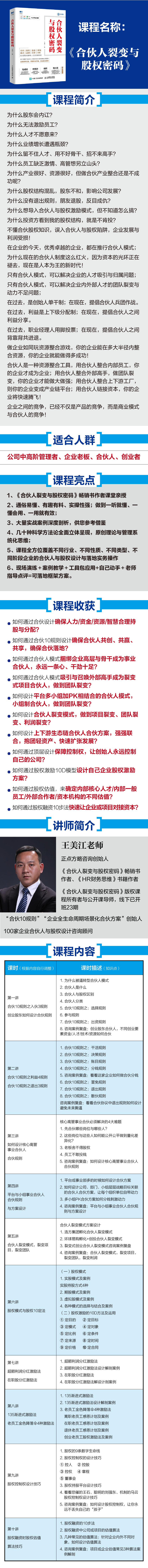 本课程名称: 王美江老师《合伙人裂变与股权密码》3天2晚咨询班