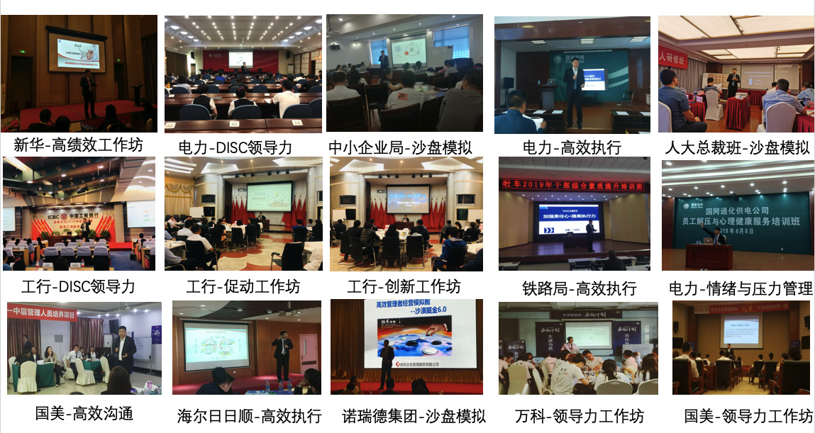 《目标管理与计划执行》课程累积交付超过百场,授课企业包括中国铁路、中国银行、国家电网等;《管理能力提升》《领导力》课程累积交付近百余场,授课企业包括:潍柴动力、光大银行、中国石油、新华保险等;《时间管理与工作效率提升》、《高效能人士的七项修炼》、《职业素养》等课程累积交付超过百余场,授课企业包括:中核、中建、农业银行等。